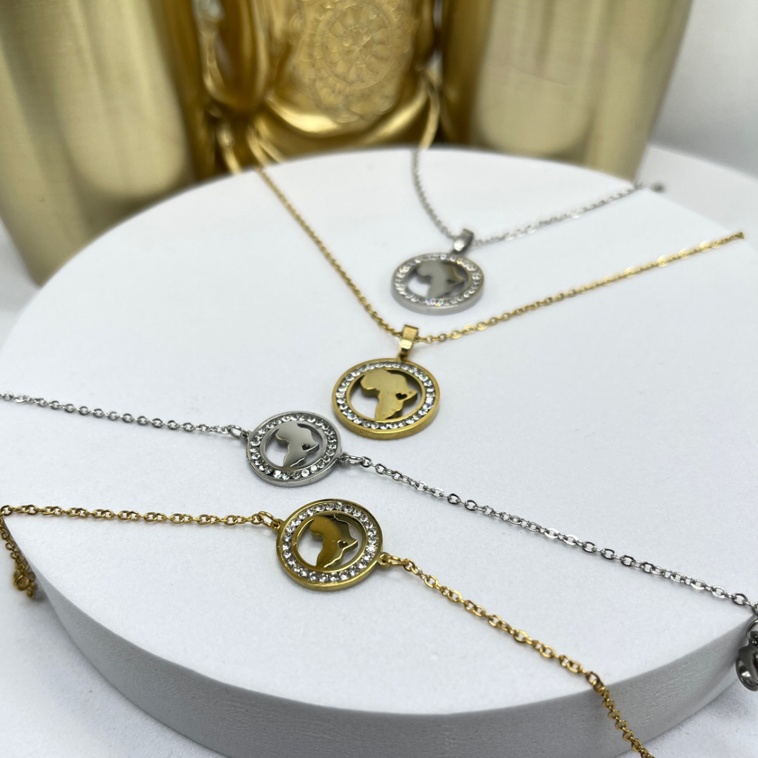 This gorgeous Map of Africa Crystal Necklace & Bracelet Set is perfect for those who appreciate beauty and strength in equal measure. The hypoallergenic and tarnish-resistant necklace and bracelet are adorned with crystal rhinestones and set in circular bezels, finished off with a heart press. Whether you're buying it for yourself or gifting it to someone special, this stunning crystal jewellery set is sure to create beautiful memories. Get this unique and meaningful set today, inspired by the Swahili word 'Jabali' (jah-bah-lee), which means 'rock'!