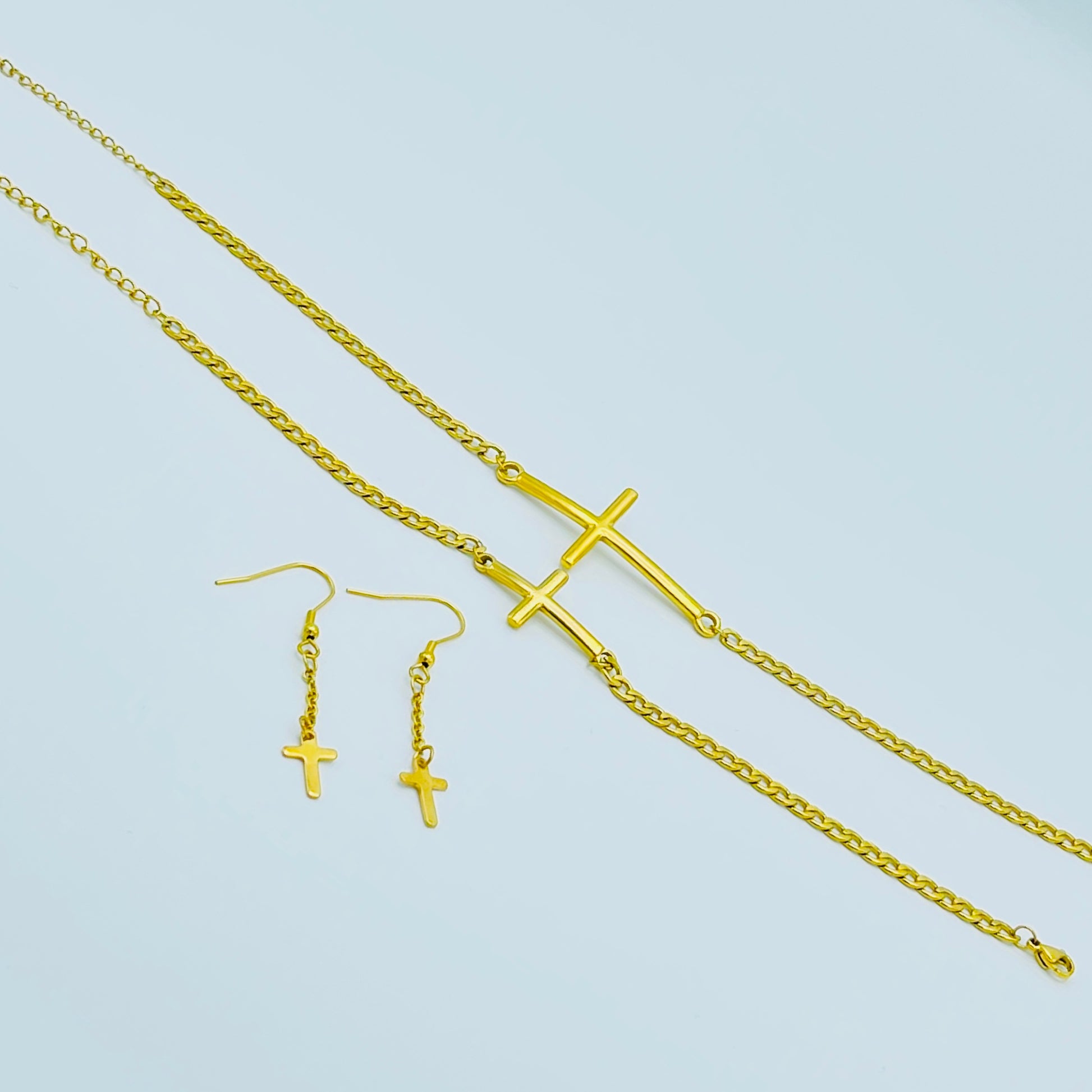 This gold jewellery set is designed to bring you protection, confidence, and safety. The set features a Cuban link bracelet with a beautiful cross charm, dangling O link chain cross charm earrings, Cuban link necklace with cross pendant while the anklet shows off a beautiful gold Cuban link chain design in its simplicity with a hint of glitz and glam.