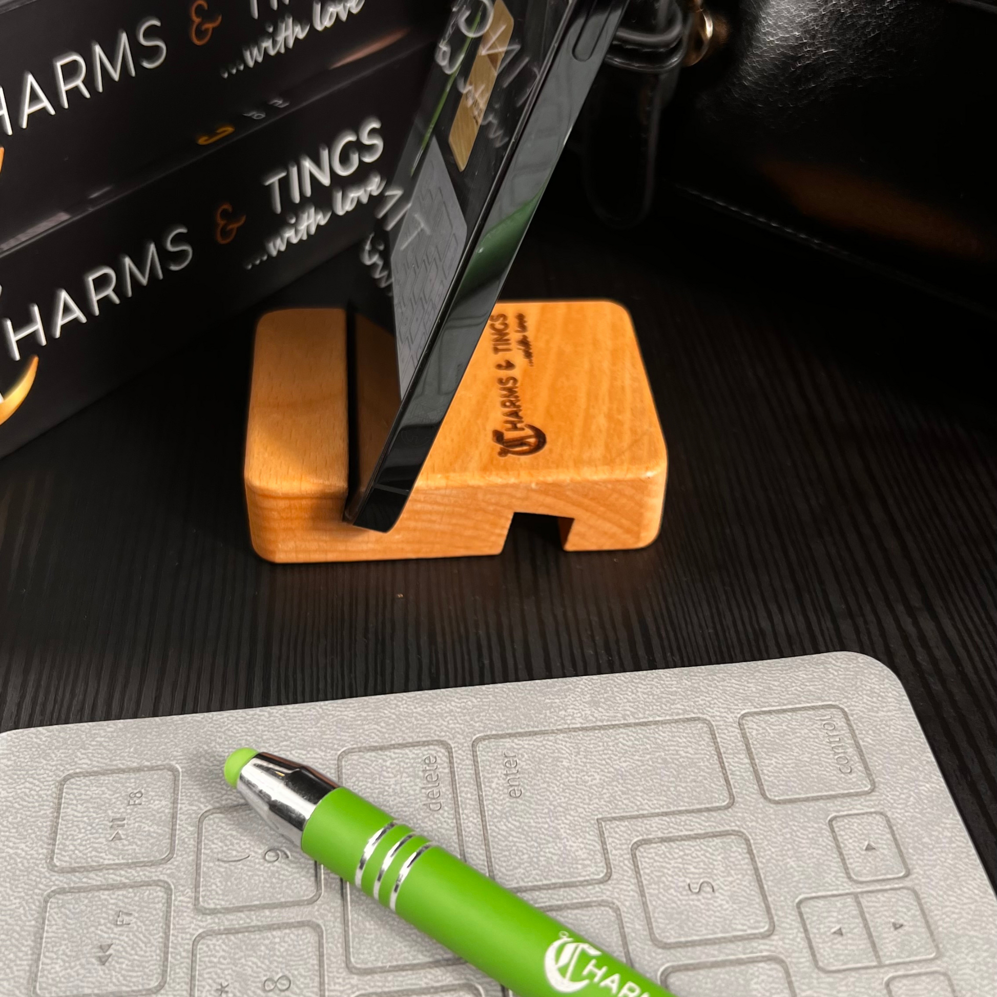 This sleek solid wood portable phone or tablet stand is a must have.